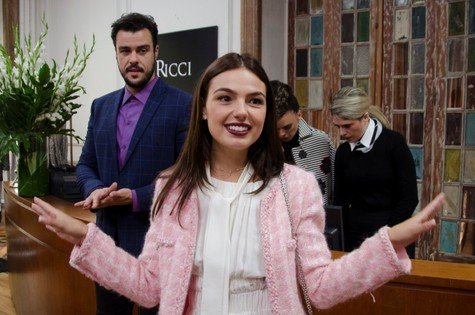 Eu fiz uma pesquisa com seis vlogueiras e elas foram super queridas. Naty Rosa, Nicole, Maria, Tassia e a Lala, elas me acolheram na vida delas e eu fiz uma pesquisa grande de jeito, de gestos, de jeito de falar, como elas se portam na frente das pessoas, como elas se portam na frente de amigos, da familia, no trabalho. Eu absorvi um pouquinho de cada uma. Tem um tiquezinho da Maria, de passar a mao no cabelo quando está nervosa. Achei muito fofo, muito feminino e roubei para Katrina, que também tem esse jeitinho.