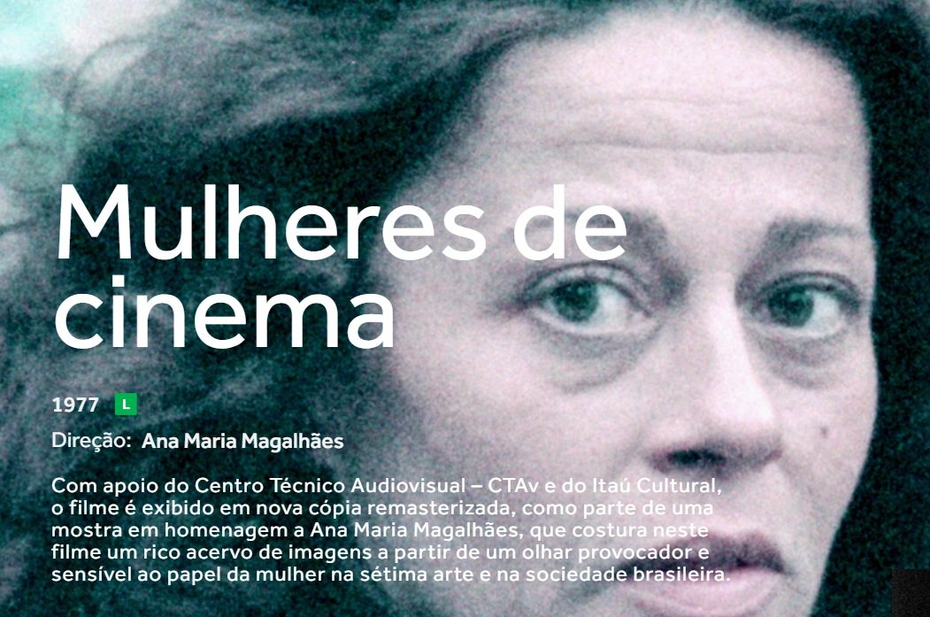 A versão remasterizada de Mulheres de Cinema ficará disponível com exclusividade na Itaú Cultural Play. A produção costura um rico acervo de imagens a partir de um olhar provocador e sensível sobre o papel da mulher no cinema e na sociedade brasileira. As atrizes Eva Nil e Eliana Macedo, as cineastas e produtoras Carmen Santos e Gilda de Abreu são algumas das personagens retratadas e que participaram ativamente na construção da cinematografia brasileira. “Apesar de ter sido feito na década de 1970, o filme é considerado atual, pois ainda sou convidada constantemente para dar entrevistas sobre a atuação das mulheres no cinema, tema que já até inspirou séries e outros documentários”, diz ela.