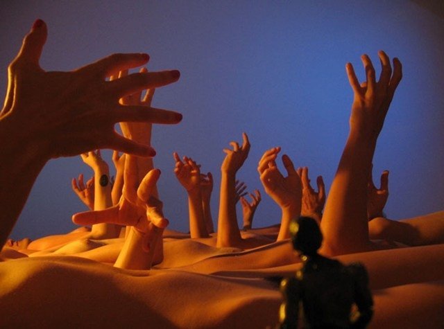 Cordas, fita silver tape e outras coisas para garantir a imobilização e impedir que a pessoa consiga evitar o terror que está bem na sua frente. A diabólicas máquinas e estruturas foram criadas pela artista plástica Cris Bierrenbach (que também tirou todas as fotos que ilustram este texto). São equipamentos que fazem até o Jigsaw (de Jogos mortais) ficar com inveja. Auxiliados pelo assistente-carrasco Ravel Cabral, os voluntários agonizam para que o cineasta Jean-Claude (Jean-Claude Bernardet) possa criar seu documentário.